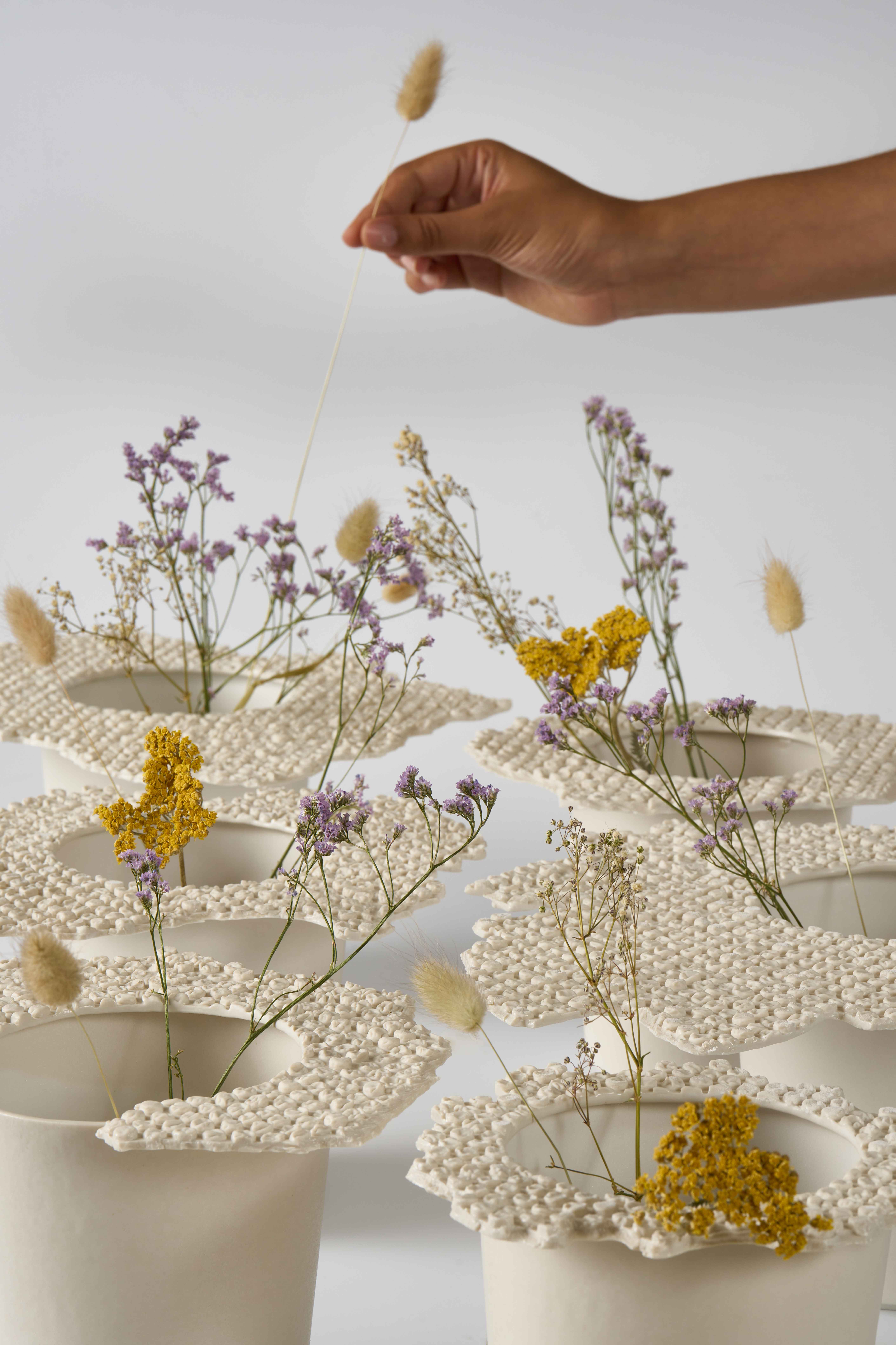 Porcelain Wrap is a limited series of provocative sculptural vases with a pure aesthetic that responds to the opportunities in the making process. This series contrasts the protective and disposable texture of bubble wrap with the delicate preciousness of porcelain resulting in irresistibly tactile pieces. The series of vases gives a preciousness to a texture designed for protection and this contradiction results in dynamic and often uneasy outcomes.